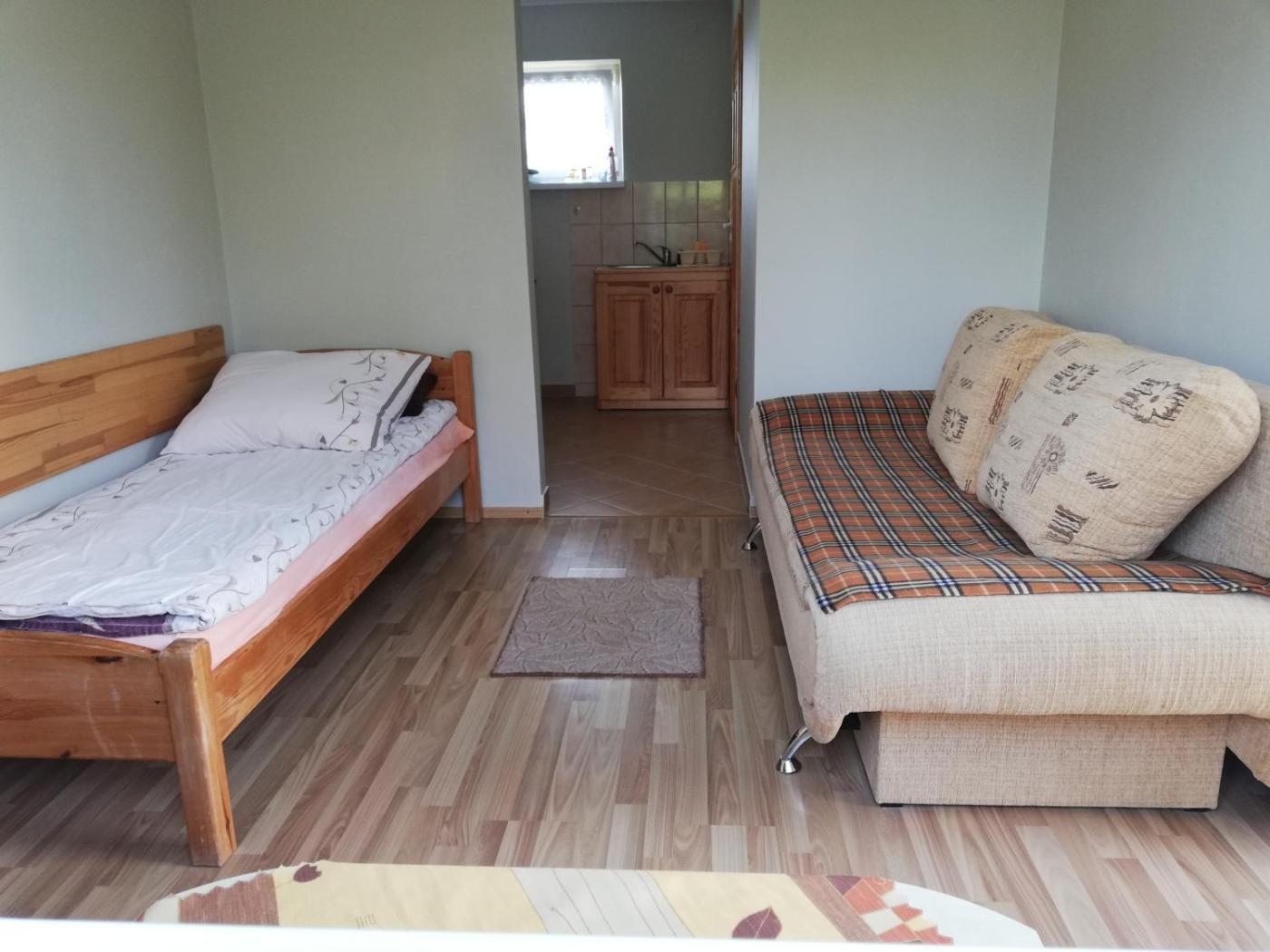 Domek z 1 sypialnią. Featuring a private entrance, this chalet also is comprised of 1 separate bedroom and 1 bathroom with a shower. This chalet features a wardrobe, an electric kettle, a flat-screen TV and garden views. The unit offers 3 beds. Domek - 4 osobowy. Powierzchnia pokoju ok.: 22 mkw.